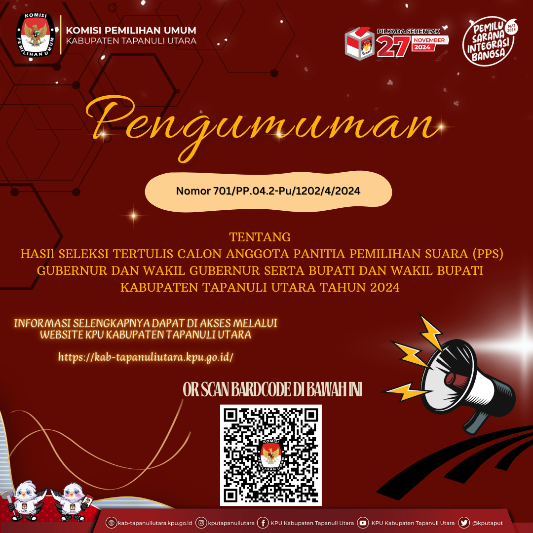Berikut ini kami sampaikan Keputusan Komisi Pemilihan Umum Kabupaten Tapanuli Utara Nomor 1172 Tahun 2024 Tentang "SYARAT MINIMAL PEROLEHAN JUMLAH KURSI ATAU JUMLAH SUARA SAH SEBAGAI SYARAT PENCALONAN PASANGAN CALON DARI PARTAI POLITIK ATAU GABUNGAN PARTAI POLITIK DALAM PEMILIHAN BUPATI DAN WAKIL BUPATI TAPANULI UTARA TAHUN 2024"